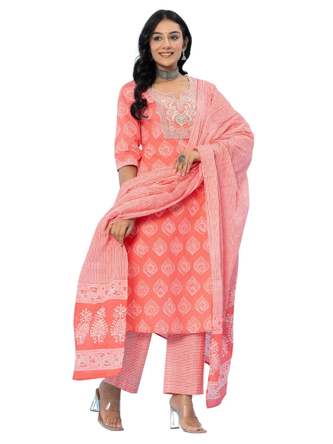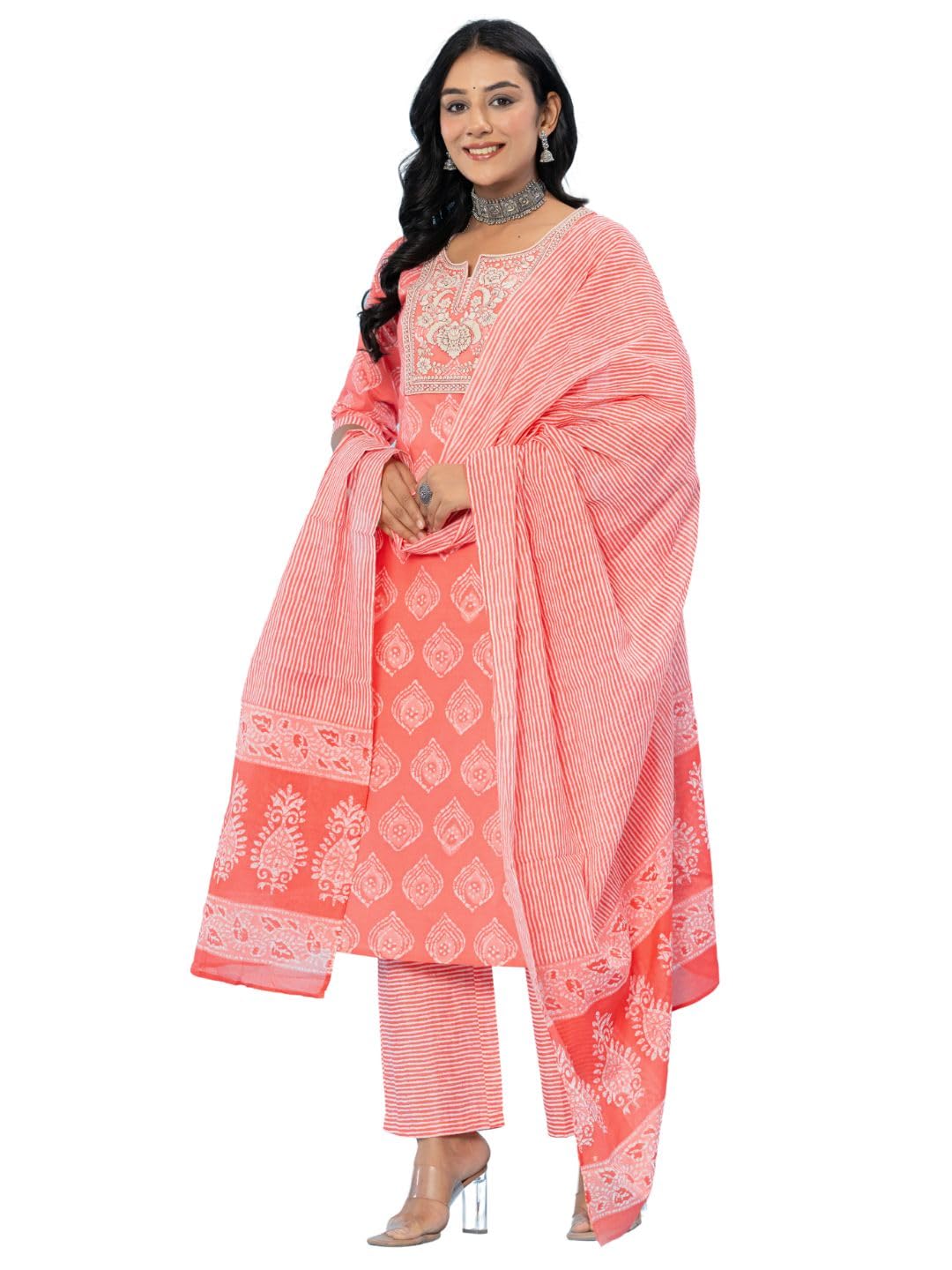 Amayra Women’s Cotton Embroidered Straight Kurta with Palazzo Pant and Dupatta Set