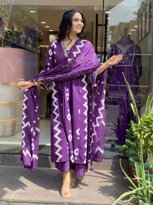 Rangnavi Women’s Cotton Anarkali Printed V-Neck Kurta with Palazzo & Dupatta | Ethnic Set | Dupatta Set | Suit Set |Kurta Set |